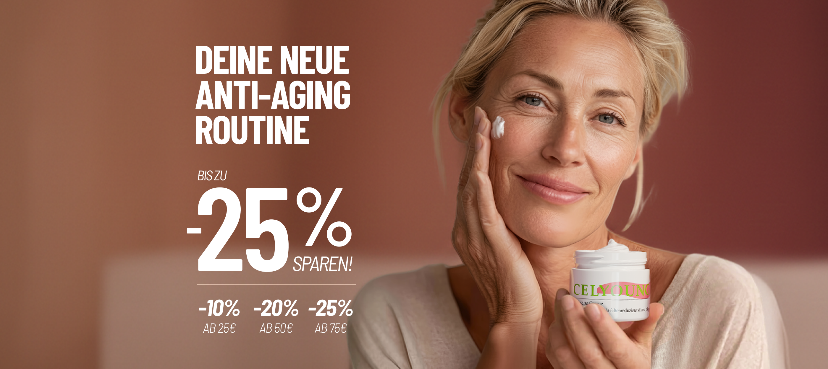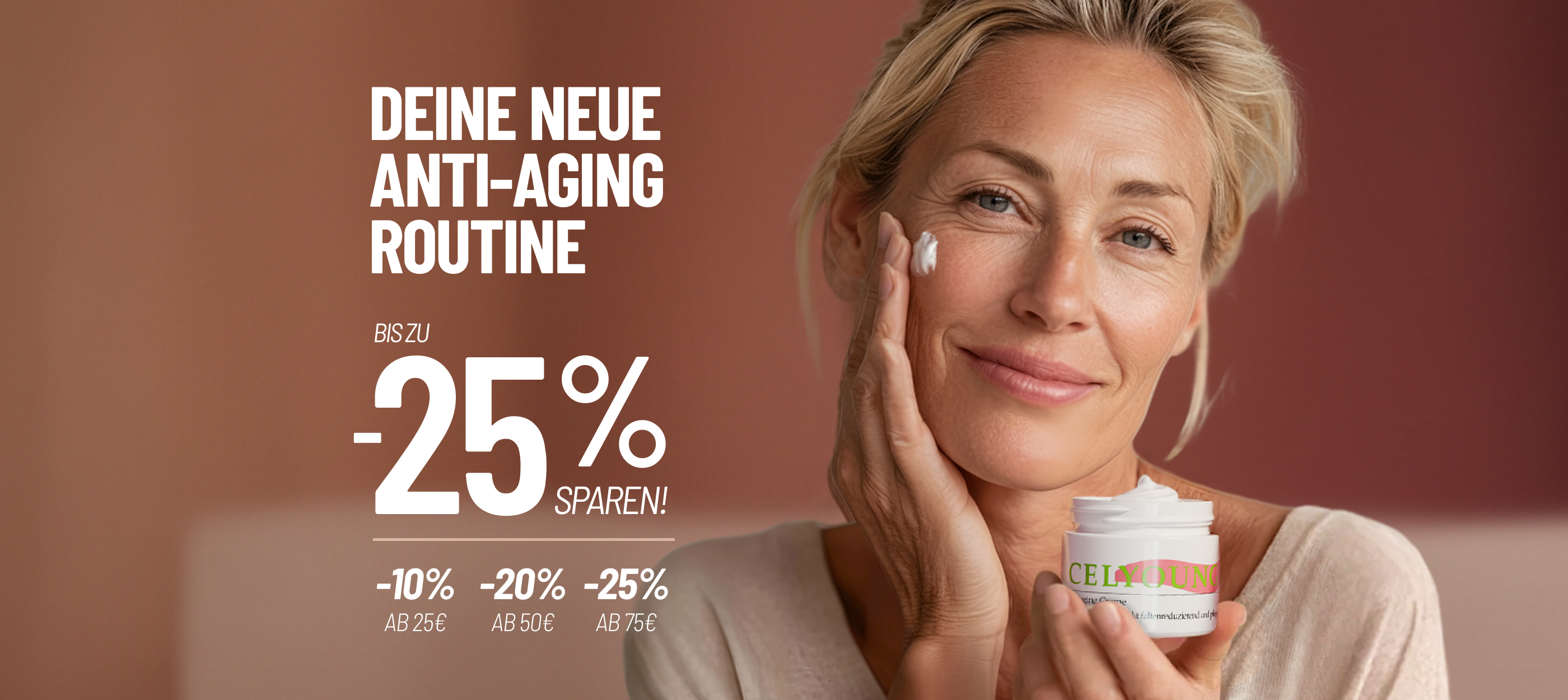 "Ich fühle mich keine Falte älter - seit 20 Jahren! Die Celyoung Antiaging Creme fühlt sich so gut auf der Haut an. Sie spendet Feuchtigkeit, zieht sofort ein, glänzt und klebt nicht und macht Falten fast wie unsichtbar."